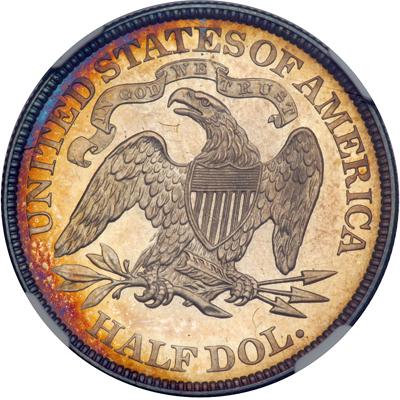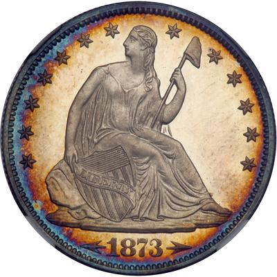 1873 Liberty Seated Half Dollar. Arrows. NGC graded Proof 65 Cameo. Lovely rainbow toning around the edges. 550 proofs minted. Pop 7; 6 in PF66 CAM.