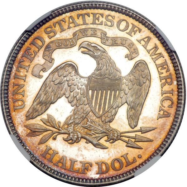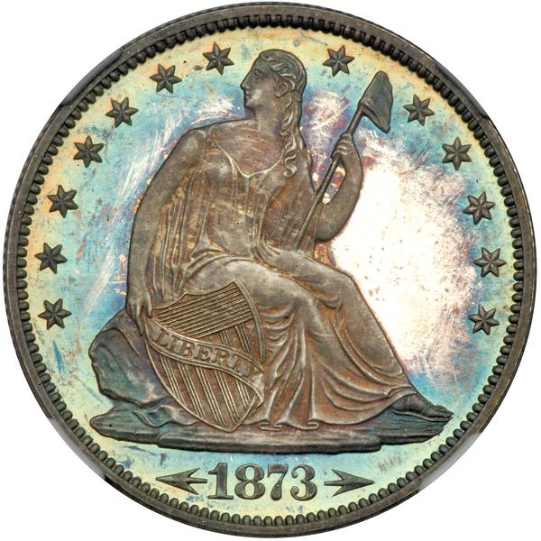 When the adjusted weight coins were introduced beginning in 1873, the tolerance was wide enough that the previous blanks could still be used. The half dollars coined from 1853 through 1873 had a standard weight of 12.44 grams while the new half dollars beginning in 1873 had a higher weight standard set at 12.50 grams. The tolerance was plus or minus 0.2 grams, which meant that any planchet that weighed between 12.30 and 12.70 grams was legal. Walter Breen, the noted numismatic scholar, was of the opinion that the mint did not make any actual adjustments to the previous standard in use. The most likely scenario is that they began producing blank planchets at the new weight standard, but went ahead and coined all of the previous blanks that had been prepared and were awaiting coinage. This is a frosted cameo Gem with fully glittering mirror surfaces and extraordinarily forceful aesthetic appeal. Few survivors from the mintage of Proof coins this year come within hailing distance of this, and no finer examples have ever been certified by NGC. Pop 2; none finer.