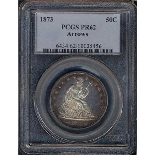 <b>1873 Liberty Seated Half Dollar. Arrows. PCGS graded Proof 62.</b> A few light hairlines give way to the underlying deep mirrors and soft frosted devices on this lightly toned example. Only 600 Proofs issued for 1873, all having the Closed 3 as these were struck early in the year before the date digit was modified in February that year <b>(PCGS # 6434)</b>