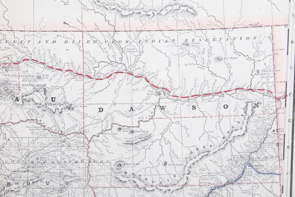 Featured in this lot is a Montana county and railroad map originating from the 1800's. The map is printed on one sheet of paper that is creased in the center. The maps show rail lines, towns, counties, and reservations. The map is in good condition and has minor edge wear and fold marks. The paper measures 25" x 17 1/2".