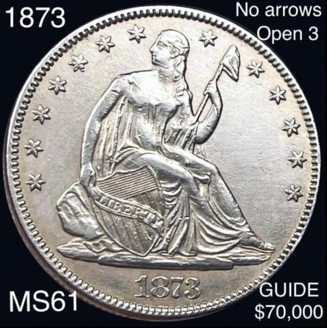 1873 NO ARROWS OPEN 3 Seated Half Dollar UNC