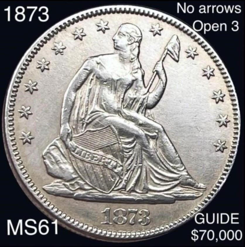 1873 NO ARROWS OPEN 3 Seated Half Dollar UNC