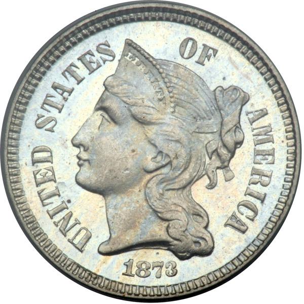 1873 Nickel Three Cents. Closed 3. PCGS graded Proof 64 Cameo. Light hint of tone. Only 1,100+ minted. Pop 21; 55 finer (PCGS # 83769) .