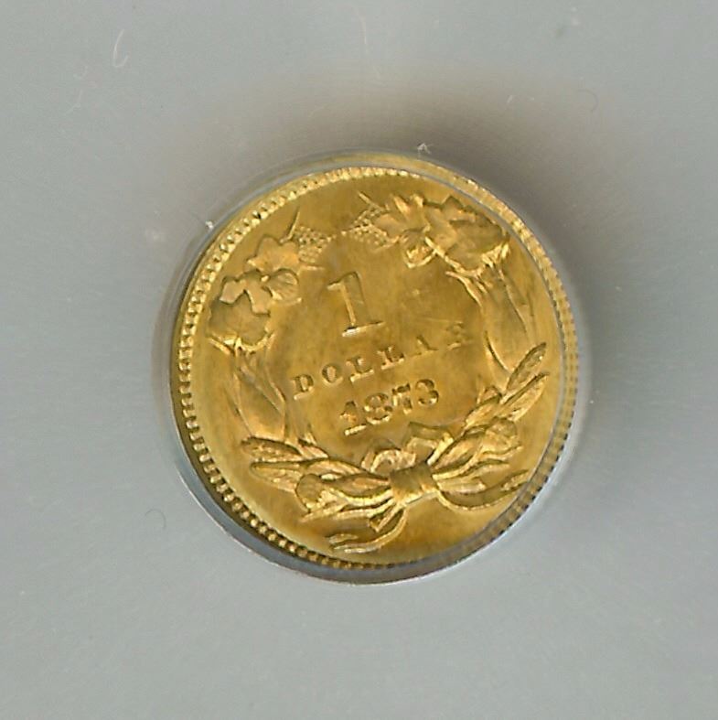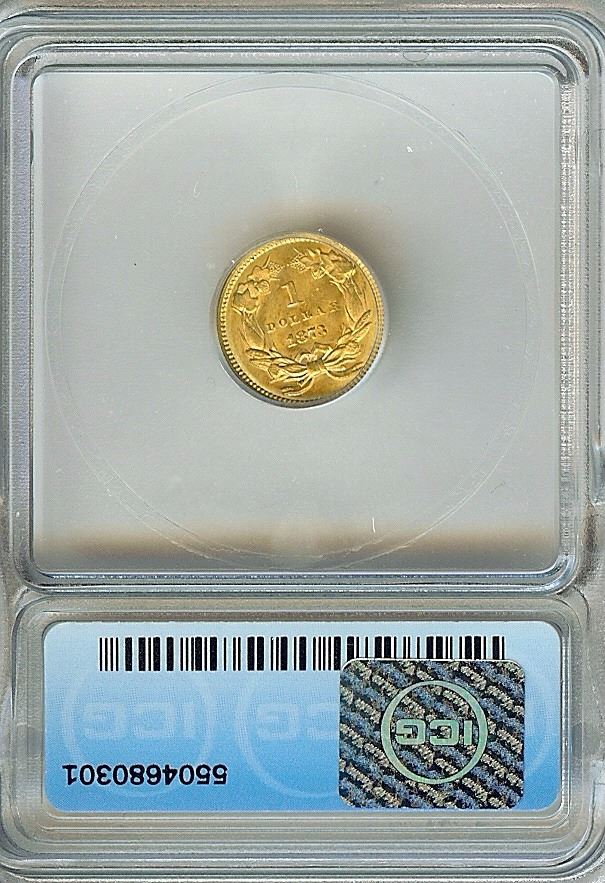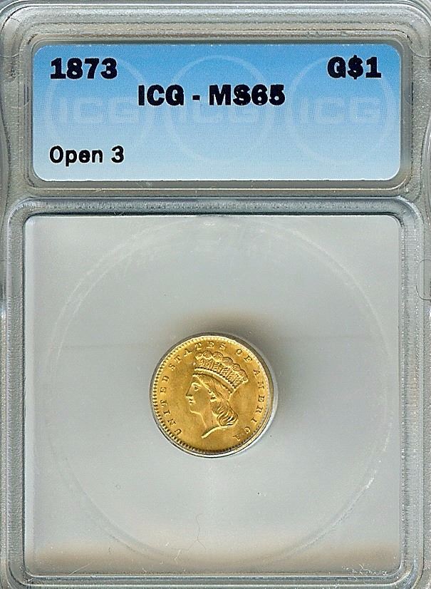 1873 OPEN 3 INDIAN PRINCESS GOLD $1 ICG MS65 RARE THIS NICE!