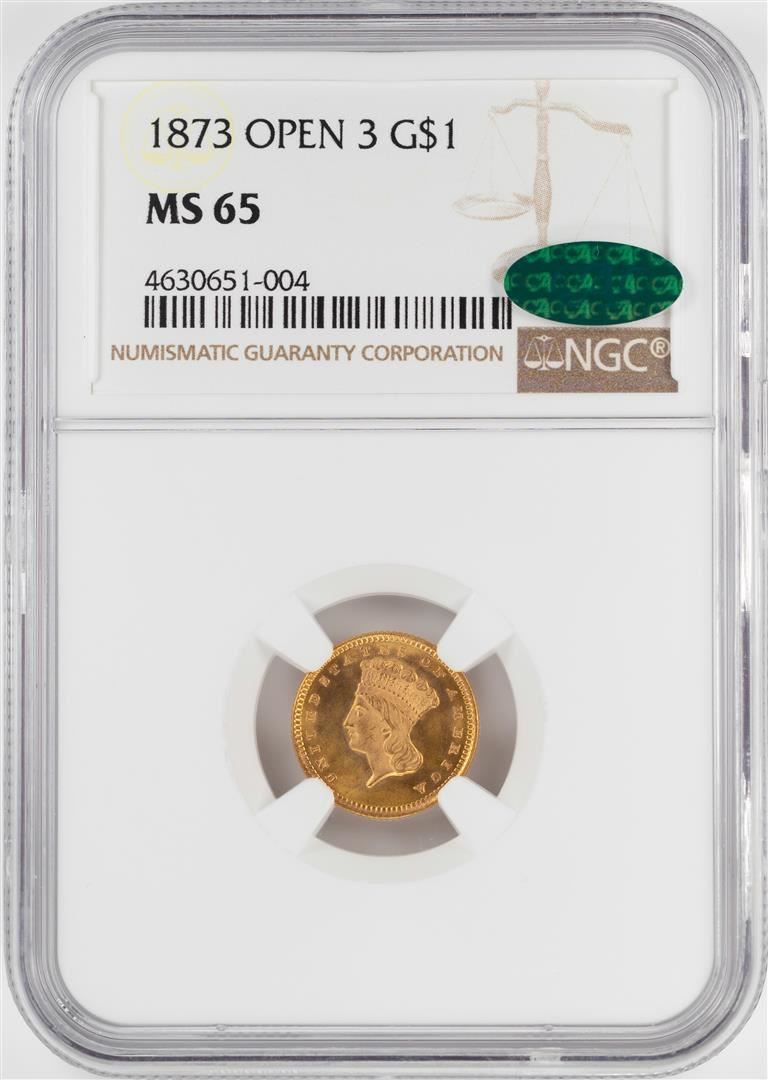 One 1873 Open 3 $1 Indian Princess Head Gold Dollar Coin NGC MS65 CAC. NGC Certified.