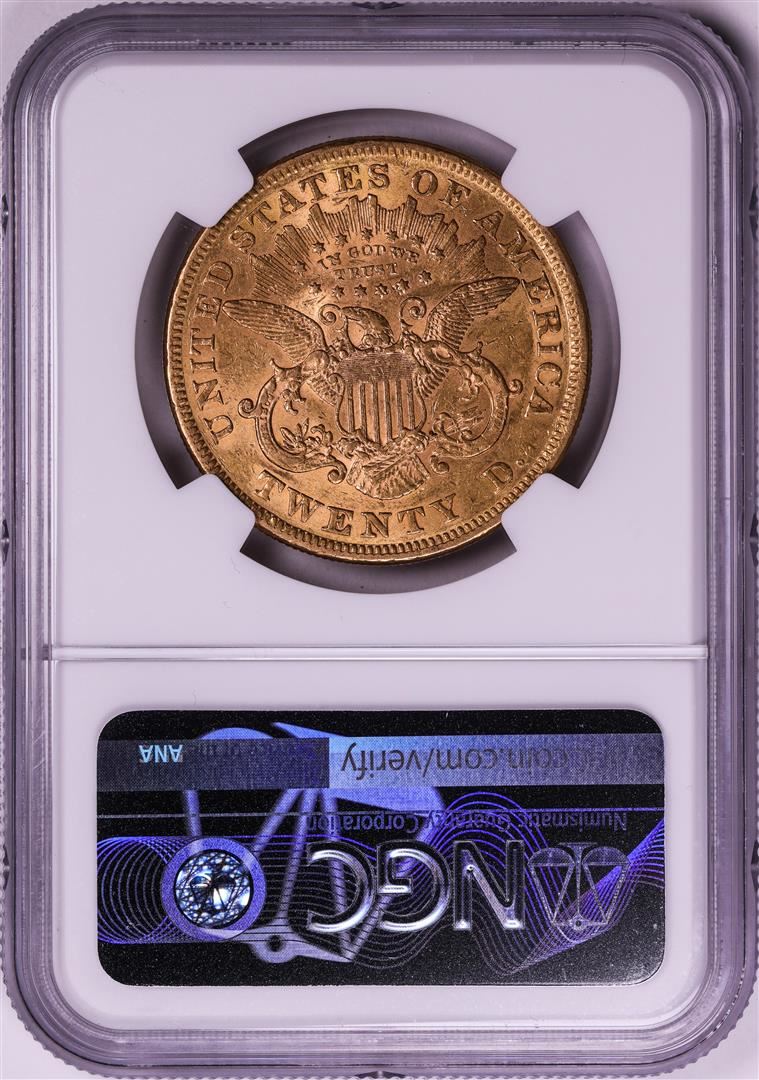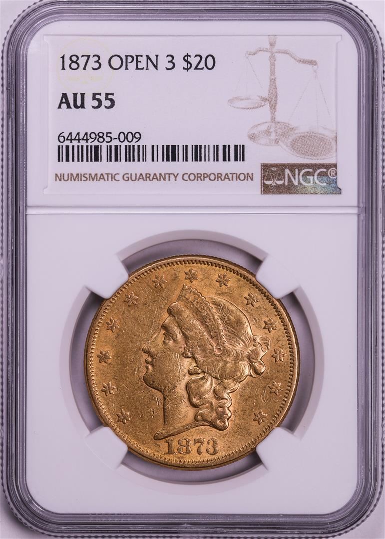 One 1873 Open 3 $20 Liberty Head Double Eagle Gold Coin NGC AU55. NGC Certified.