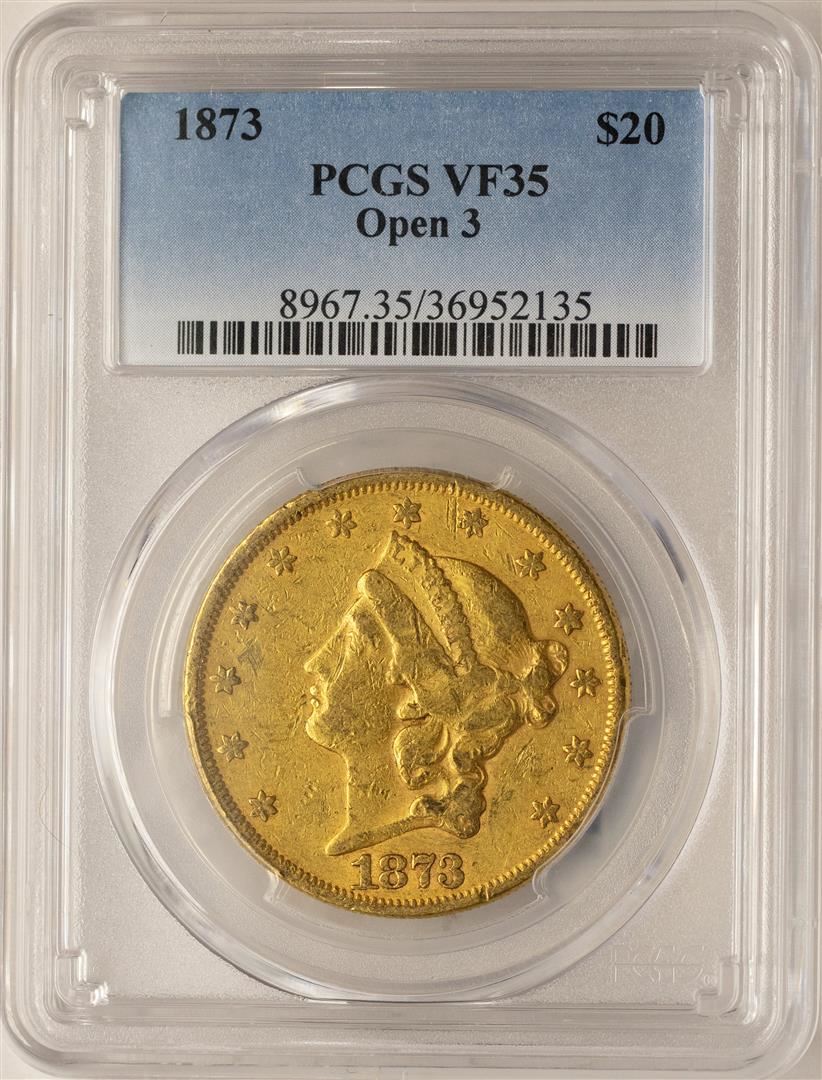 One 1873 Open 3 $20 Liberty Head Double Eagle Gold Coin PCGS VF35. PCGS Graded.