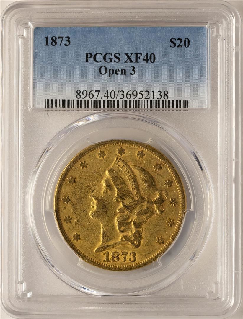 One 1873 Open 3 $20 Liberty Head Double Eagle Gold Coin PCGS XF40. PCGS Graded.