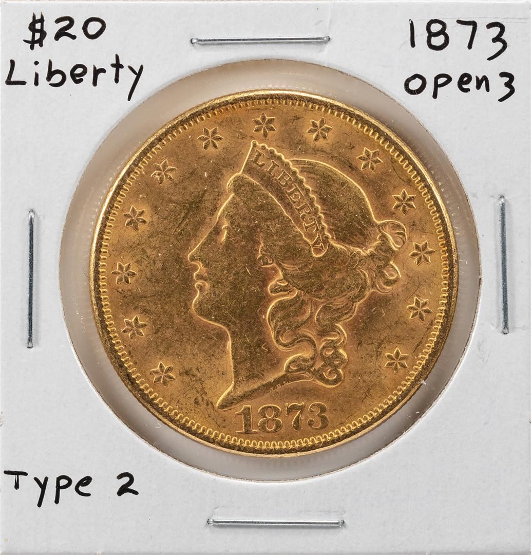 One 1873 Open 3 $20 Liberty Head Double Eagle Gold Coin.
