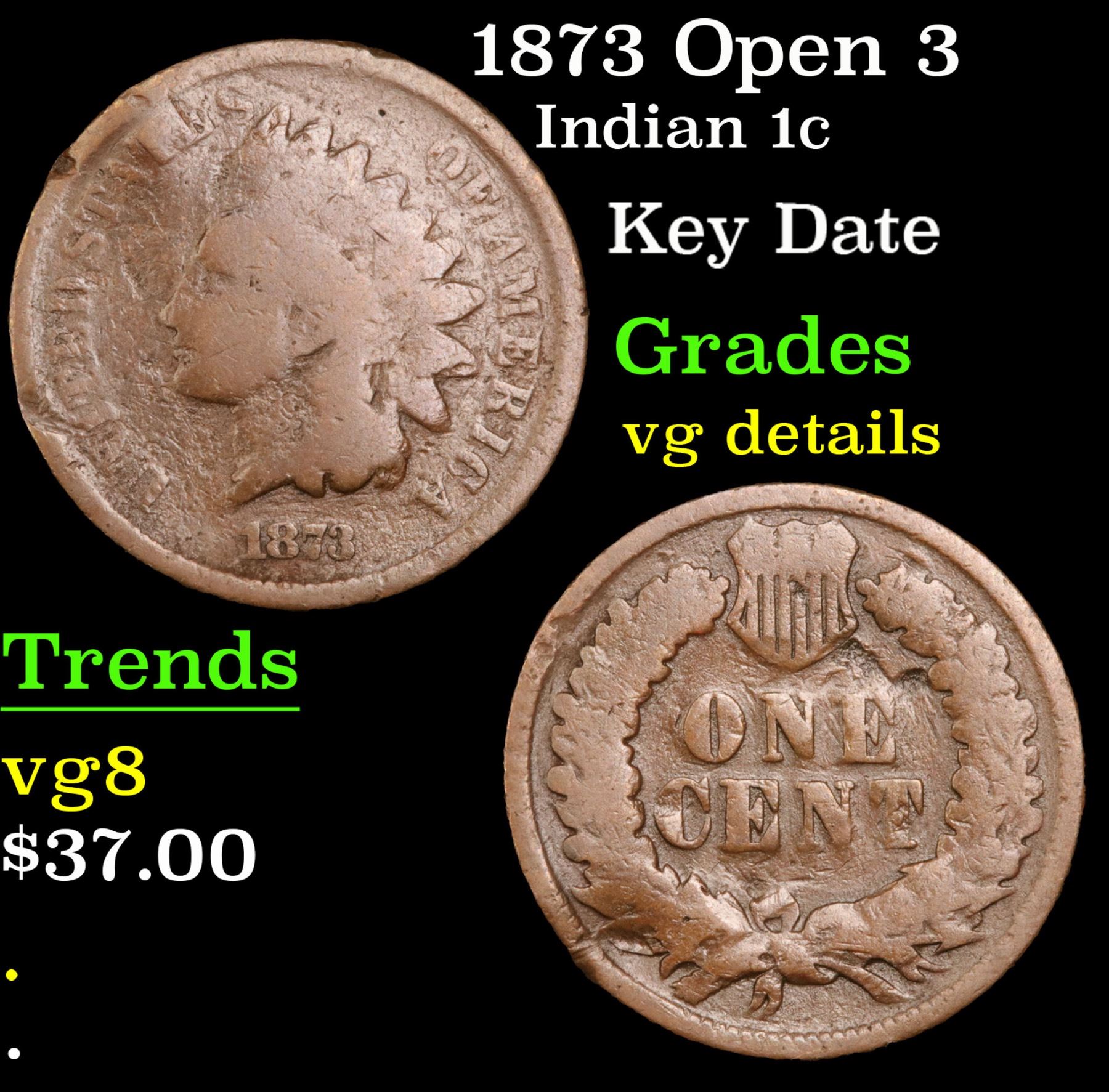 1873 Open 3 Key Date . Indian Cent 1c Grades vg details.