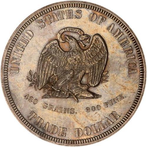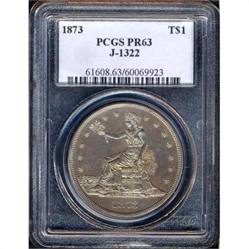 <b>1873 Pattern Trade Dollar. Silver, reeded edge. Judd-1322. Pollock-1465. PCGS graded Proof 63.</b> Similar to the regular issue of 1873 with the seated figure of Liberty; on the reverse, an eagle that is materially smaller than on the adopted design, set slightly above center in the field with 420 GRAINS. 900 FINE. below on a slight curve. Medium bright silver color from original surfaces unmarred marks but overlaid by some delicate golden russet toning most in evidence on the reverse. A strong strike as well, making this a desirable Pattern trade dollar <b>(PCGS # 61608)</b>