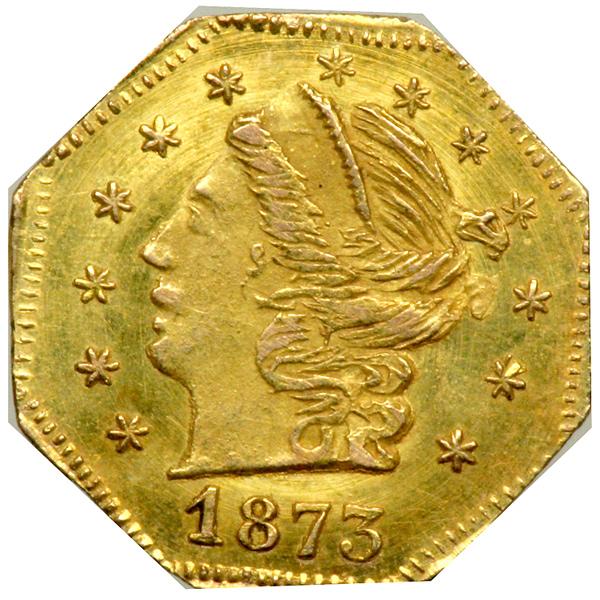 1873 Quarter Dollar Octagonal Liberty. BG-727 High Rarity 4. NGC graded MS-64. Nice golden toning. An affordable Second Period quarter dollar, the fraction on the reverse lacks its fraction bar. Glittering fields and frosted devices. Pop 3; 5 finer, 4 in 65, 1 in 66.