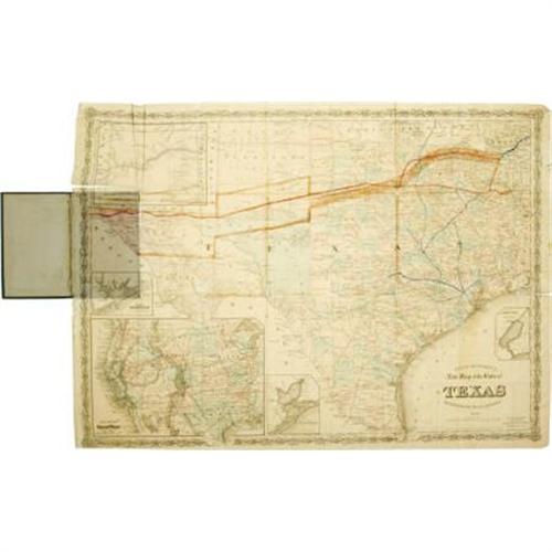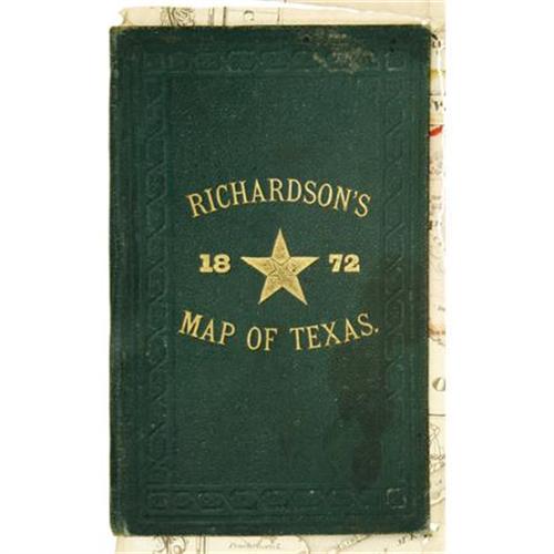 <B>Willard Richardson: </B></I><B><I>New Map of the State of Texas</B></I></B></I><B>, 1873</B></I> (New York: G. W. and C. B. Colton Company, 1873), 26.75" x 19.5". In 1837, Willard Richardson (1802-1875) settled in Texas, where he worked as a teacher, newspaperman, and publisher of a series of Texas almanacs. This hand-colored map, prepared for the 1873 almanac, includes five insets: "<I>Plan of the Northern Part or Panhandle of Texas</B></I>," "<I>Plan of the Great West</B></I>," "<I>Plan of Matagorda Bay</B></I>," "<I>Plan of Sabine Lake</B></I>," and "<I>Plan of Galveston Bay</B></I>." The map was originally folded into a small (6" x 4"), leather-bound pocket folder with gold lettering (dated 1872), which is also included. In very good condition with tiny pieces missing along some folds, corner creases, minor spotting, and chipping on the edges. <I>Ex. Dallas Historical Society.</B></I><BR><BR><b>Shipping:</b> Flat Material, Large (<a target="_blank" href="http://www.heritageauctions.com/common/shipping.php">view shipping information</a>)