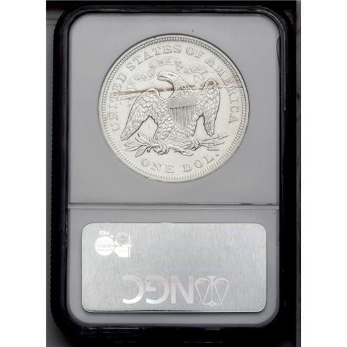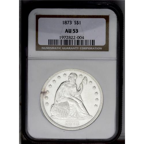 <B>1873<img border='0' src='http://www.heritagecoins.com/images/star.gif' width=10 height=10>$1> AU53 NGC.</B></I> Substantial luster remains evident on each side of this lightly circulated example. A bright snow-white coin, except for a small purple-brown spot near 9 o'clock on the obverse rim, and a dark reddish-brown and green toning streak that horizontally bisects the upper reverse. Faintly worn on the highpoints with numerous small field marks. Unlike the 1871 and 1872 issues, the 1873 does not have a particularly high mintage, perhaps due to the advent of the Trade Dollar. <BR><BR><B>Important notice:</B> Heritage usually auctions material at the rate of 200-250 lots per hour. On some occasions eBay Live bid software or the Internet may not be able to keep up with the pace of the auction. We recommend placing a realistic absentee bid now as insurance to avoid disappointment. Occasionally the auctioneer may eliminate or reject an eBay Live bid, and the auctioneer may also reopen a lot after the close of the eBay live bidding (usually because we missed an audience bid), and may reject your bid even if it shows you as the winning bidder. By bidding via eBay Live, you agree that Heritage may award the lot to another bidder at its sole discretion under the circumstances described above or any other reasonable circumstances. Since eBay bids are not shown to us until we open the lot on the floor, we treat those bids just like floor bids. In most cases the floor responds before the eBay bid is presented to us, due to Internet lag time, so for consistency we have made it a policy that floor bids are always considered first over tie eBay live bids. Also please note that all Heritage lots purchased through eBay Live carry a 20% Buyer's Premium. Please make sure you read the Terms and Conditions before you bid. This lot is being auctioned in conjunction with a live floor auction by Heritage Galleries & Auctioneers. All final auction and invoice information will be supplied by Heritage Galleries & Auctioneers, and all other information should be considered preliminary. Lot:2200 <BR><BR><B>Winning Notification and Billing:</B> After the FINAL session in this auction is complete, Heritage will send e-mail and snail mail invoices. This process normally takes several days. All final auction and invoice information will be supplied by Heritage Galleries & Auctioneers, and all other information should be considered preliminary. <BR><BR>This auction will be conducted on a live auction floor and over the Internet through eBay Live. If you choose to place an absentee bid, please take a moment to <font color='#0000ff'><u><a href='http://pages.ebay.com/liveauctions/help/before/laabsentee.html'>learn how eBay Live absentee bidding works</a></u></font><font color='#000000'>