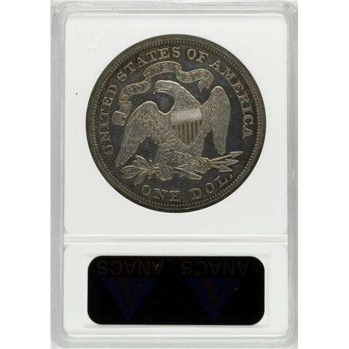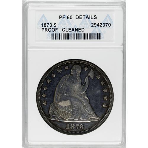 <B>1873 S$1 --Cleaned--ANACS. PR60 Details.</B></I> Beautiful golden-brown and electric-blue patina invigorates this well struck but hairlined final-year specimen. The reverse field displays faint fingerprint fragments.<BR><BR><b>Shipping:</b> Coins & Currency (<a target="_blank" href="http://www.heritageauctions.com/common/shipping.php">view shipping information</a>)