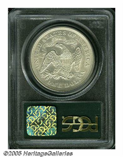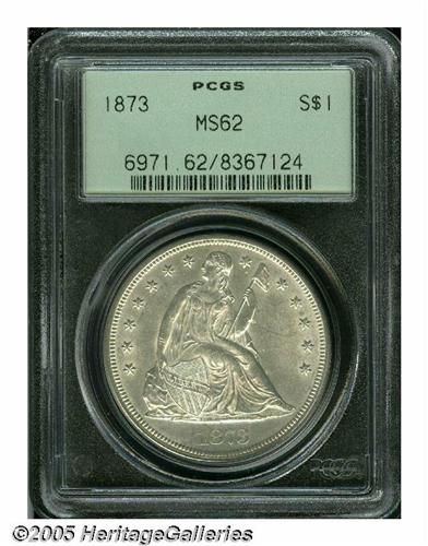 <B>1873<S$1> MS62 PCGS.</B></I> Final year of issue for the Seated Dollar design. Well struck, highly lustrous and untoned, with a pleasing frosty sheen on both sides, and an unmarked reverse. A few minor contact marks and slide marks, on the obverse, define the grade of the piece. Population: 25 in 62, 37 finer (6/05).<BR><I>From The Dr. John L. Pellegrini Collection of Liberty Seated Dollars.</B></I>