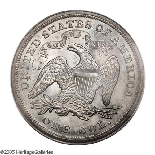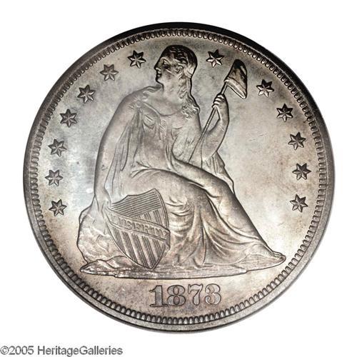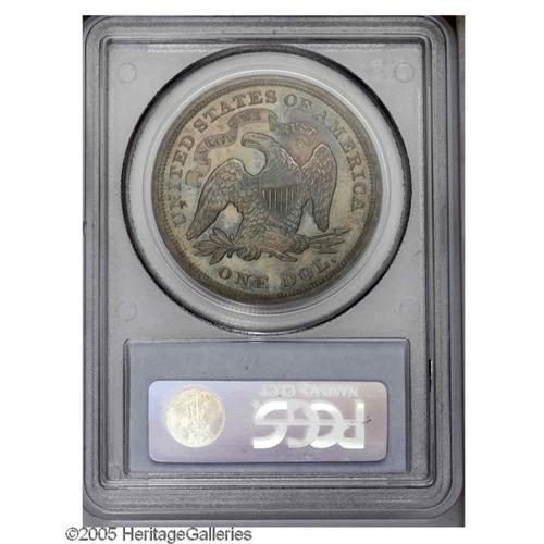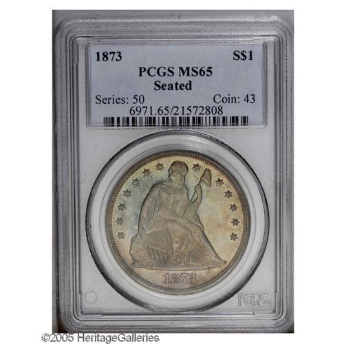 <B>1873<S$1> MS65 PCGS.</B></I> An important Gem representative and among the nicest 1873 Seated dollars we have ever offered of this unheralded final year issue. The surfaces are toned in intermingled shades of mauve, antique-golden, and steel-blue that allow for full appreciation of the shimmering underlying luster. Both sides possess a richly frosted texture and the striking definition, often an area of deficiency on the 1873, is virtually complete. Only a few glancing blemishes are noted on the portrait, being most congregated over Liberty's breast and upper arm. The reverse is extraordinarily smooth.<BR> Silver Dollar coinage at the Philadelphia Mint remained strong and steady through the first three months of 1873. On March 29 of that year, however, the facility delivered its final 11,500 Dollars of the Seated Liberty design in response to the Mint Act of February 12. This brought the total for the year to 293,000 pieces. Although this is a respectable mintage for the series, the Mint melted many of these coins to provide bullion for its initial delivery of Trade Dollars. As a result, yet not widely recognized as such, the 1873 is an elusive issue that is particularly rare in the finer Mint State grades. Population: 5 in 65, 1 finer (11/05).