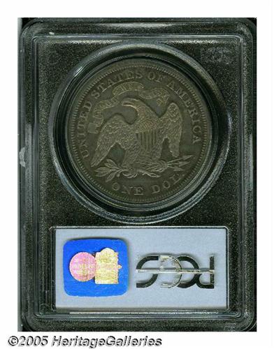 <B>1873<S$1> PR62 PCGS.</B></I> A deeply toned specimen, lightly hairlined but displaying complete watery brilliance in the fields. Final year of the Seated Liberty design and always a popular type coin.<BR><I>From The Dr. John L. Pellegrini Collection of Liberty Seated Dollars.</B></I>
