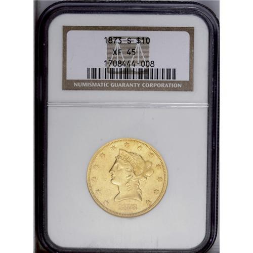 <B>1873-S<$10> XF45 NGC.</B></I> From an original mintage of only 12,000 pieces comes this lightly circulated survivor. The orange-gold fields have a glassy appearance, with snatches of original luster in the protected areas. Sharply struck for this issue with great appeal. Census: 23 in 45, 32 finer (7/06).