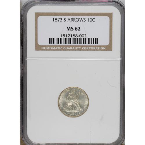 <B>1873-S 10C Arrows MS62 NGC.</B></I> Though the 1873-S has nearly twice the mintage of the 1874-S, the former is slightly more elusive in Mint State grades. This immensely lustrous Select piece has a touch of violet patina at the left reverse against otherwise brilliant surfaces. Liberty's head displays modest weakness, but the surfaces are well-preserved. Census: 6 in 62, 19 finer (4/07).<BR><BR><b>Shipping:</b> Coins & Currency (<a target="_blank" href="http://www.heritageauctions.com/common/shipping.php">view shipping information</a>)