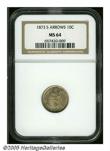 <B>1873-S<10C> Arrows MS64 NGC.</B></I> Fortin-101, Small Thin S. A relatively scarce date with an original mintage of 455,000 pieces. NGC and PCGS combined have certified just 11 pieces in near-Gem, and five specimens finer (6/05). Highly lustrous surfaces are overlain by a thin layer of light gold-tan patina, and the design elements are sharply struck. No significant marks are noted over either side.