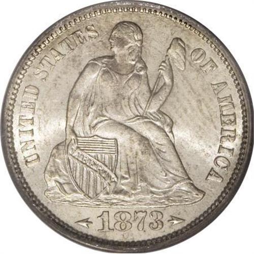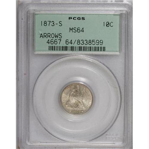 <B>1873-S 10C Arrows MS64 PCGS.</B></I> The base of the 1 is lightly repunched on this satiny and sharply struck near-Gem. Streaks of light gold patina cross both sides. Marks are limited to inconsequential grazes near the profile and above ONE. There were only two S-mint Arrows issues, with a combined mintage of less than 700,000 pieces. Housed in a former generation holder.<BR><BR><B>Coin Engraver:</B> Christian Gobrecht<BR><BR><b>Shipping:</b> Coins & Currency (<a target="_blank" href="http://www.heritageauctions.com/common/shipping.php">view shipping information</a>)