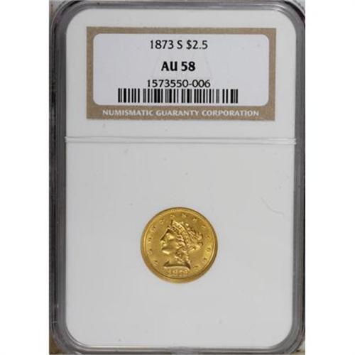 <B>1873-S $2 1/2 AU58 NGC.</B></I> Only 27,000 pieces were struck, so it comes as little surprise that the 1873-S is rare in Mint State. This bright mustard-gold example lacks detectable highpoint wear, but the fields flash instead of displaying cartwheel sheen. A clean piece with minor weakness of strike on the eagle's body. Census: 49 in 58, 25 finer (5/07).<BR><BR><b>Shipping:</b> Coins & Currency (<a target="_blank" href="http://www.heritageauctions.com/common/shipping.php">view shipping information</a>)