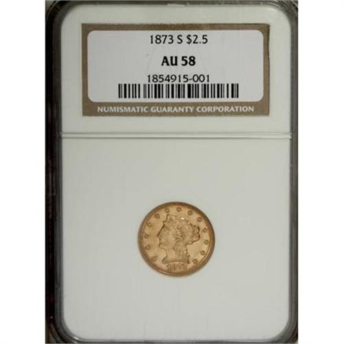 <B>1873-S $2 1/2 AU58 NGC.</B></I> The orange-gold surfaces of this near-Mint example are surprisingly flashy. A well-defined piece, minimally abraded with only a hint of highpoint friction. Census: 53 in 58, 26 finer (1/08).<BR><BR><B>Coin Engraver:</B> Christian Gobrecht<BR><BR><b>Shipping:</b> Coins & Currency (<a target="_blank" href="http://www.heritageauctions.com/common/shipping.php">view shipping information</a>)