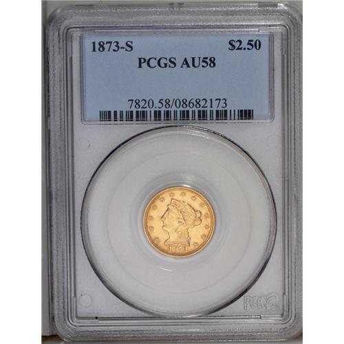<B>1873-S<$2 1/2> AU58 PCGS.</B></I> A condition rarity in Mint State, with a combined population of 42 (7/06). This straw-gold example promises the look without the cost, with nearly uninterrupted luster and a nice strike for this issue.