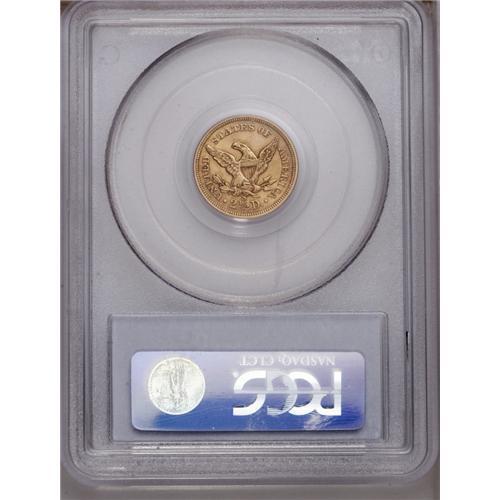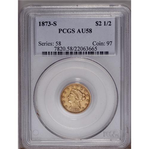 <B>1873-S $2 1/2 AU58 PCGS.</B></I> The lightly worn surfaces have a somewhat muted appearance, although orange luster gleams from the peripheries. A mere 27,000 coins were struck of this issue and it is not regularly encountered in grades higher than VF. Population: 12 in 58, 13 finer (1/06).
