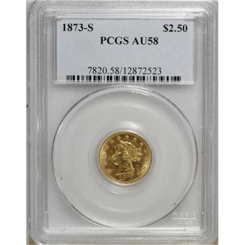 <B>1873-S $2 1/2 AU58 PCGS.</B></I> Sharply struck with shining yellow-gold surfaces that show faint undercurrents of green. A minimally marked piece that shows only a touch of friction on the high points. Population: 14 in 58, 12 finer (3/08).<BR><BR><B>Coin Engraver:</B> Christian Gobrecht<BR><BR><b>Shipping:</b> Coins & Currency (<a target="_blank" href="http://www.heritageauctions.com/common/shipping.php">view shipping information</a>)