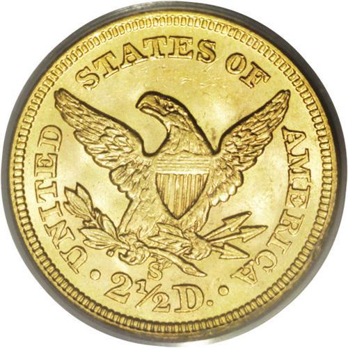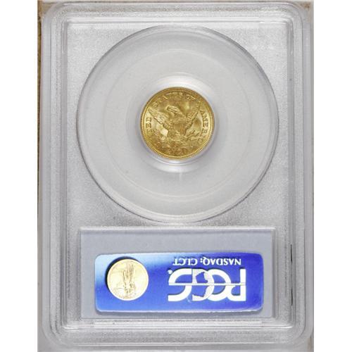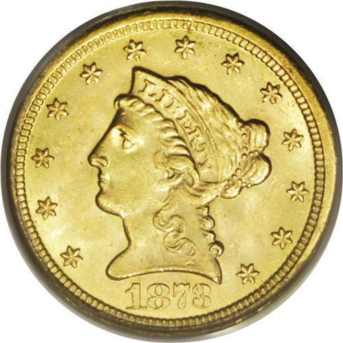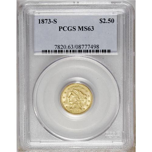 <B>1873-S<$2 1/2> MS63 PCGS.</B></I> Although perhaps not the extreme rarity in Mint State grades it might once have been considered to be, the 1873-S quarter eagle is undeniably rare in Select grades and extremely difficult to find finer. The present piece is only the second Heritage has ever offered in a grade above MS61, the other being an NGC-graded MS63 piece which realized $6,670 in our 1998 FUN sale. This is not the same coin; indeed, a comparison shows that the reverses were struck from two different dies. This peach-gold piece has decent luster and a better than average strike for the date. Like all 1873 quarter eagles struck in San Francisco, this coin has a closed 3. Population: 9 in 63, 2 finer (7/06).
