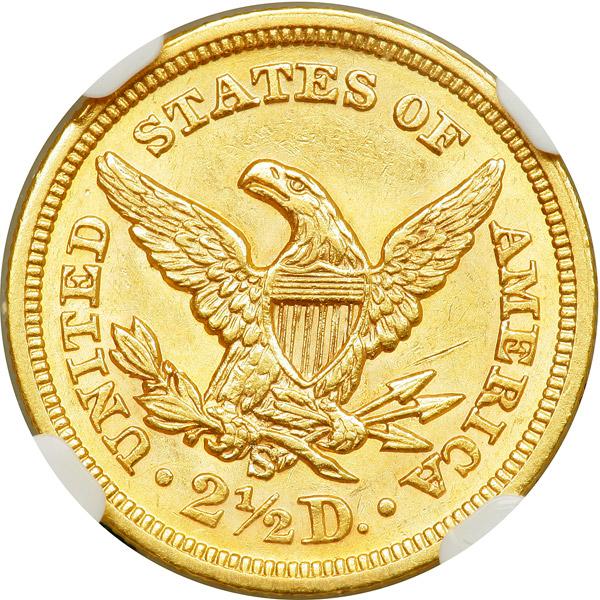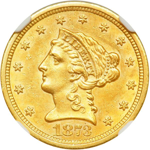 1873-S $2.50 Liberty. NGC graded AU-58. Nice light golden toning and a highly pleasing coin. 27,000 struck. Pop 57; 27 finer at NGC (PCGS # 7820) .