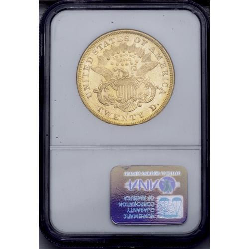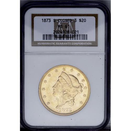 <B>1873-S<$20> Closed 3 MS61 NGC.</B></I> A fully frosted Mint State piece with typical surface marks and delightful peach-gold coloration. The obverse is lustrous with a few mentionable abrasions that serve to limit the grade. A desirable example of this esoteric 1873 variety. <BR><BR><B>Important notice:</B> Heritage usually auctions material at the rate of 200-250 lots per hour. On some occasions eBay Live bid software or the Internet may not be able to keep up with the pace of the auction. We recommend placing a realistic absentee bid now as insurance to avoid disappointment. Occasionally the auctioneer may eliminate or reject an eBay Live bid, and the auctioneer may also reopen a lot after the close of the eBay live bidding (usually because we missed an audience bid), and may reject your bid even if it shows you as the winning bidder. By bidding via eBay Live, you agree that Heritage may award the lot to another bidder at its sole discretion under the circumstances described above or any other reasonable circumstances. Since eBay bids are not shown to us until we open the lot on the floor, we treat those bids just like floor bids. In most cases the floor responds before the eBay bid is presented to us, due to Internet lag time, so for consistency we have made it a policy that floor bids are always considered first over tie eBay live bids. Also please note that all Heritage lots purchased through eBay Live carry a 20% Buyer's Premium. Please make sure you read the Terms and Conditions before you bid. This lot is being auctioned in conjunction with a live floor auction by Heritage Galleries & Auctioneers. All final auction and invoice information will be supplied by Heritage Galleries & Auctioneers, and all other information should be considered preliminary. Lot:4246 <BR><BR><B>Winning Notification and Billing:</B> After the FINAL session in this auction is complete, Heritage will send e-mail and snail mail invoices. This process normally takes several days. All final auction and invoice information will be supplied by Heritage Galleries & Auctioneers, and all other information should be considered preliminary. <BR><BR>This auction will be conducted on a live auction floor and over the Internet through eBay Live. If you choose to place an absentee bid, please take a moment to <font color='#0000ff'><u><a href='http://pages.ebay.com/liveauctions/help/before/laabsentee.html'>learn how eBay Live absentee bidding works</a></u></font><font color='#000000'>