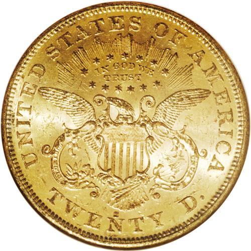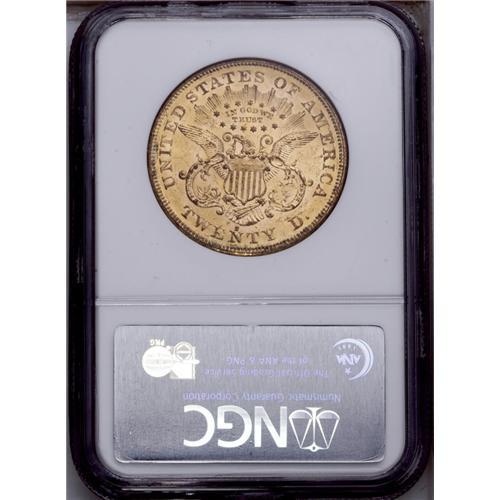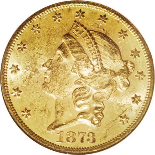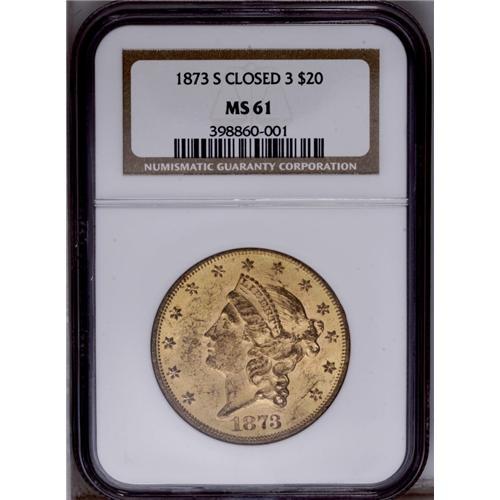 <B>1873-S $20 Closed 3 MS61 NGC.</B></I> Fully lustrous with appealing color, being limited in grade by a multitude of small to medium-sized marks on the obverse. Scarce in Mint State.