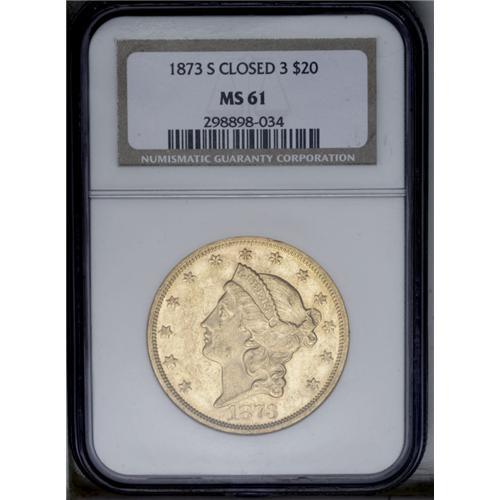 <B>1873-S $20 Closed 3 MS61 NGC.</B></I> Somewhat scarcer than its Open 3 counterpart, this is a rather lustrous coin for the MS61 grade. Both sides are, however, somewhat baggy.