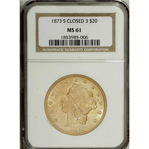 <B>1873-S $20 Closed 3 MS61 NGC.</B></I> This honey-gold double eagle is bathed in shimmering luster, and neither side possesses any distracting marks. The centers show occasional areas of softness, although the peripheries are well struck.<BR><BR><b>Shipping:</b> Coins & Currency (<a target="_blank" href="http://www.heritageauctions.com/common/shipping.php">view shipping information</a>)