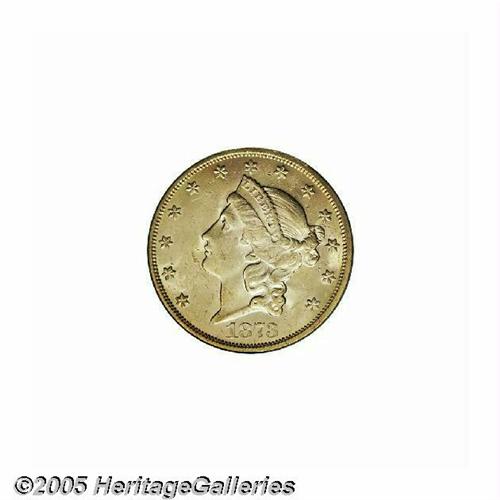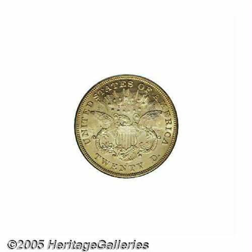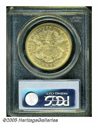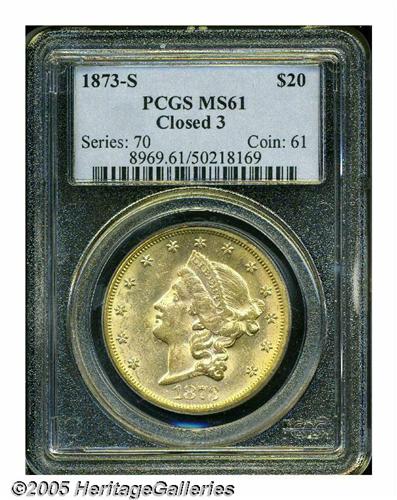 <B>1873-S<$20> Closed 3 MS61 PCGS.</B></I> A lustrous Double Eagle that has a good strike and moderately abraded surfaces. Although not as rare as the Open 3 variety of the issue, the Closed 3 is still scarce in Uncirculated condition. Population: 51 in 61, 9 finer (5/05).