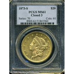 <B>1873-S $20 Closed 3 MS61 PCGS.</B></I> Frosty and lustrous, with the usual handling marks expected for the grade. Liberty's face and neck are generally clean for this grade, with none of the deep or distracting marks which are frequently found on coins of this period. A pleasing type coin and a date which is very difficult to find any finer. Population: 48 in 61, 9 finer (1/05). Lot:9079