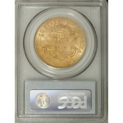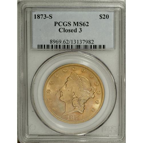 <B>1873-S $20 Closed 3 MS62 PCGS.</B></I> The Closed 3 (or Close 3) is more common than the Open 3 variety, but Bowers points out that few collectors care about the difference, opting for a single 1873-S example. This piece offers radiant mellow orange-gold surfaces, with considerable prooflikeness on the reverse. The few light abrasions noted are grade-consistent, and the strike is sharp. Like so many so-called "common" issues in the Liberty Head double eagle series, the 1873-S is seldom seen above MS62. Population: 18 in 62, 2 finer (4/07).<BR><BR><b>Shipping:</b> Coins & Currency (<a target="_blank" href="http://www.heritageauctions.com/common/shipping.php">view shipping information</a>)