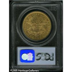 <B>1873-S $20 Open 3 AU50 PCGS.</B></I> The Open 3 S-mint twenty from this year is the scarcer of the two date variants. This is an attractive orange-gold example that retains a fair amount of mint luster around the devices. Its only detractions are a few medium sized marks on the obverse. Lot:9081