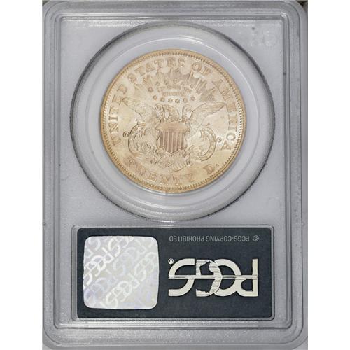 <B>1873-S<$20> Open 3 AU53 PCGS.</B></I> The San Francisco Mint struck more than 1 million double eagles in 1873, but most were the Closed 3 variety. Apparently, Open 3 dies took their time in their long journey from Philadelphia to the West coast. This partly lustrous older holder example is attractive despite moderate marks near the front of Liberty's neck. Certified in a green label holder.