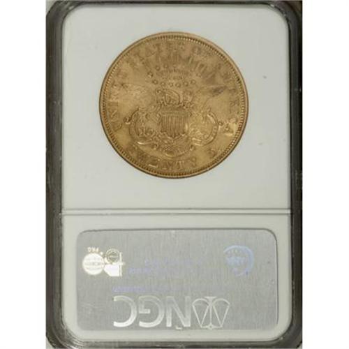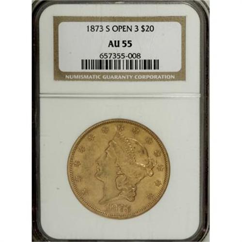 <B>1873-S $20 Open 3 AU55 NGC.</B></I> NGC Census: (116/250). PCGS Population (41/78). Numismedia Wsl. Price for NGC/PCGS coin in AU55: $1,925. (#8979)<BR><BR><B>Coin Engraver:</B> James B. Longacre<BR><BR><b>Shipping:</b> Coins & Currency (<a target="_blank" href="http://www.heritageauctions.com/common/shipping.php">view shipping information</a>\)
