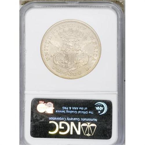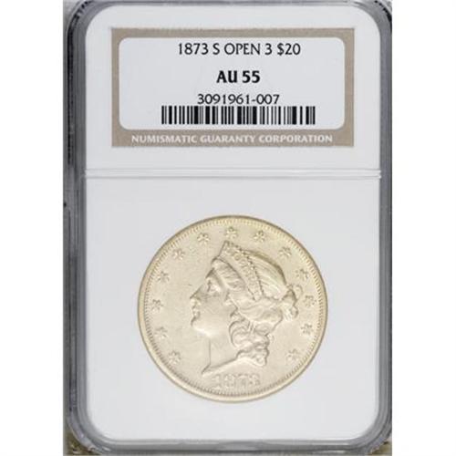 <B>1873-S $20 Open 3 AU55 NGC.</B></I> Although the 1873-S Closed 3 is common, the Open 3 is scarce, since the Open 3 dies were made in Philadelphia and took their time arriving in San Francisco. Marks are distributed, but luster is plentiful, especially on the reverse.<BR><BR><B>Coin Engraver:</B> James B. Longacre<BR><BR><b>Shipping:</b> Coins & Currency (<a target="_blank" href="http://www.heritageauctions.com/common/shipping.php">view shipping information</a>)