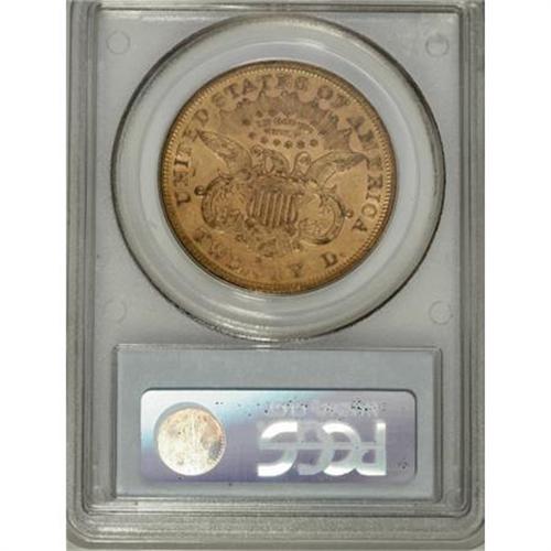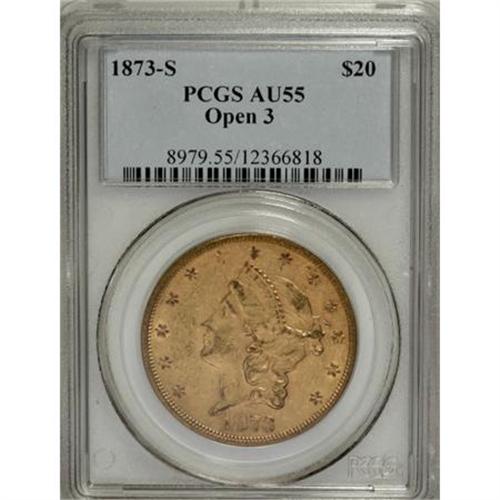 <B>1873-S $20 Open 3 AU55 PCGS.</B></I> Well defined for the issue, with rich apricot-gold patina covering both sides. Traces of luster reside in the protected areas, and marks are well distributed, somewhat more so on the obverse.<BR><BR><B>Coin Engraver:</B> James B. Longacre<BR><BR><b>Shipping:</b> Coins & Currency (<a target="_blank" href="http://www.heritageauctions.com/common/shipping.php">view shipping information</a>)