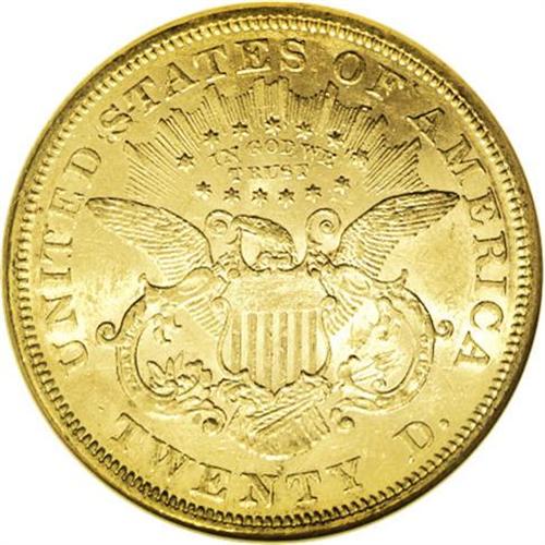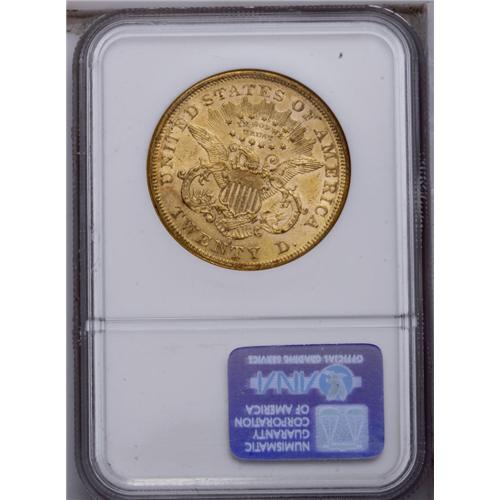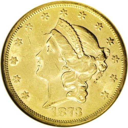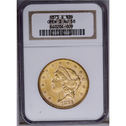 <B>1873-S<$20> Open 3 AU58 NGC.</B></I> Although the Open 3 Philadelphia issue is common, dies with the new date logotype had to travel cross-country from the mother mint to San Francisco. By this time, most of the million-plus mintage for the year had already been struck with Closed 3 dies. This lemon-gold example has a pinscratch on the cheekbone and a faint grease streak beneath the hair bun. <BR><BR><B>Important notice:</B> Heritage usually auctions material at the rate of 200-250 lots per hour. On some occasions eBay Live bid software or the Internet may not be able to keep up with the pace of the auction. We recommend placing a realistic absentee bid now as insurance to avoid disappointment. Occasionally the auctioneer may eliminate or reject an eBay Live bid, and the auctioneer may also reopen a lot after the close of the eBay live bidding (usually because we missed an audience bid), and may reject your bid even if it shows you as the winning bidder. By bidding via eBay Live, you agree that Heritage may award the lot to another bidder at its sole discretion under the circumstances described above or any other reasonable circumstances. Since eBay bids are not shown to us until we open the lot on the floor, we treat those bids just like floor bids. In most cases the floor responds before the eBay bid is presented to us, due to Internet lag time, so for consistency we have made it a policy that floor bids are always considered first over tie eBay live bids. Also please note that all Heritage lots purchased through eBay Live carry a 20% Buyer's Premium. Please make sure you read the Terms and Conditions before you bid. This lot is being auctioned in conjunction with a live floor auction by Heritage Galleries & Auctioneers. All final auction and invoice information will be supplied by Heritage Galleries & Auctioneers, and all other information should be considered preliminary. Lot:4247 <BR><BR><B>Winning Notification and Billing:</B> After the FINAL session in this auction is complete, Heritage will send e-mail and snail mail invoices. This process normally takes several days. All final auction and invoice information will be supplied by Heritage Galleries & Auctioneers, and all other information should be considered preliminary. <BR><BR>This auction will be conducted on a live auction floor and over the Internet through eBay Live. If you choose to place an absentee bid, please take a moment to <font color='#0000ff'><u><a href='http://pages.ebay.com/liveauctions/help/before/laabsentee.html'>learn how eBay Live absentee bidding works</a></u></font><font color='#000000'>