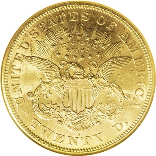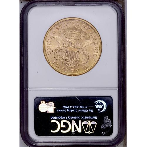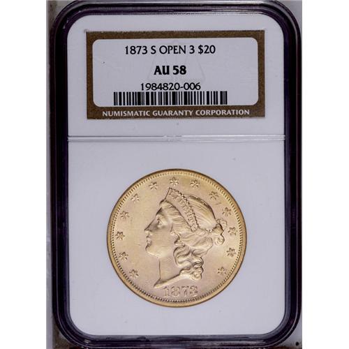 <B>1873-S<$20> Open 3 AU58 NGC.</B></I> The coruscating mint luster is essentially complete, and this crisply struck example would be considered Uncirculated by many observers. A trace of wear is detected on the bust tip, and perhaps this led to the conservative third party grade. Struck from clashed dies. <BR><BR><B>Important notice:</B> Heritage usually auctions material at the rate of 200-250 lots per hour. On some occasions eBay Live bid software or the Internet may not be able to keep up with the pace of the auction. We recommend placing a realistic absentee bid now as insurance to avoid disappointment. Occasionally the auctioneer may eliminate or reject an eBay Live bid, and the auctioneer may also reopen a lot after the close of the eBay live bidding (usually because we missed an audience bid), and may reject your bid even if it shows you as the winning bidder. By bidding via eBay Live, you agree that Heritage may award the lot to another bidder at its sole discretion under the circumstances described above or any other reasonable circumstances. Since eBay bids are not shown to us until we open the lot on the floor, we treat those bids just like floor bids. In most cases the floor responds before the eBay bid is presented to us, due to Internet lag time, so for consistency we have made it a policy that floor bids are always considered first over tie eBay live bids. Also please note that all Heritage lots purchased through eBay Live carry a 20% Buyer's Premium. Please make sure you read the Terms and Conditions before you bid. This lot is being auctioned in conjunction with a live floor auction by Heritage Galleries & Auctioneers. All final auction and invoice information will be supplied by Heritage Galleries & Auctioneers, and all other information should be considered preliminary. Lot:4248 <BR><BR><B>Winning Notification and Billing:</B> After the FINAL session in this auction is complete, Heritage will send e-mail and snail mail invoices. This process normally takes several days. All final auction and invoice information will be supplied by Heritage Galleries & Auctioneers, and all other information should be considered preliminary. <BR><BR>This auction will be conducted on a live auction floor and over the Internet through eBay Live. If you choose to place an absentee bid, please take a moment to <font color='#0000ff'><u><a href='http://pages.ebay.com/liveauctions/help/before/laabsentee.html'>learn how eBay Live absentee bidding works</a></u></font><font color='#000000'>