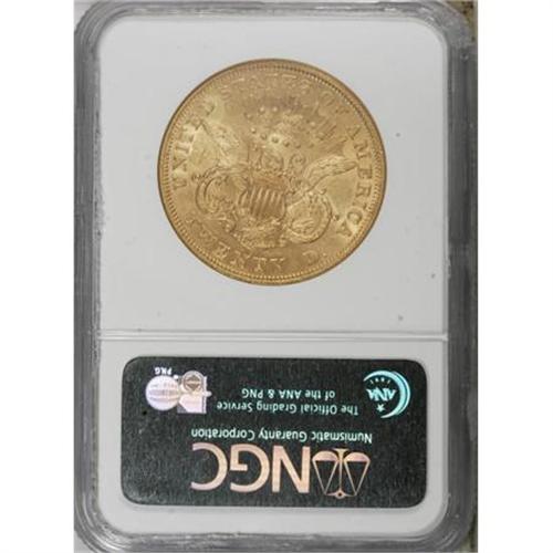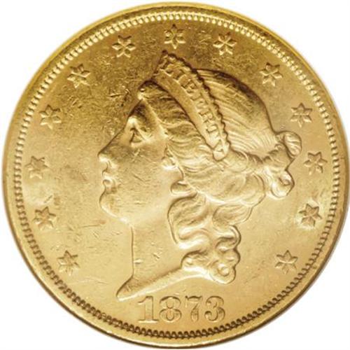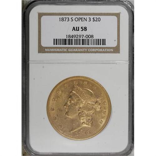 <B>1873-S $20 Open 3 AU58 NGC.</B></I> Well-defined for the issue with minor friction on the highest parts of the design. The lightly abraded yellow-gold fields retain nearly all of their original luster. The Open 3 logotype replaced the Closed 3 logotype, which came under criticism as looking like an 8.<BR><BR><b>Shipping:</b> Coins & Currency (<a target="_blank" href="http://www.heritageauctions.com/common/shipping.php">view shipping information</a>)