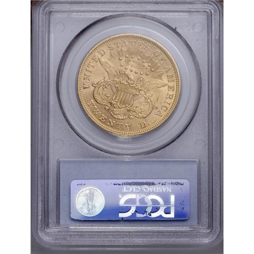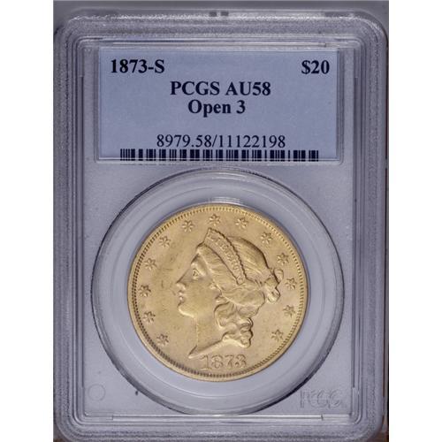 <B>1873-S<$20> Open 3 AU58 PCGS.</B></I> The Open 3 1873-S is a scarce and important Coronet Double Eagle. Its Closed 3 counterpart is several times more common than the Open 3. This is a moderately lustrous piece with a decent strike and the usual number of contact marks for the grade. Pronounced pink color dominates the crevices of the obverse, and about 30 degrees of clockwise die rotation is also noted. Population: 44 in 58, 37 finer (3/06). <BR><BR><B>Important notice:</B> Heritage usually auctions material at the rate of 200-250 lots per hour. On some occasions eBay Live bid software or the Internet may not be able to keep up with the pace of the auction. We recommend placing a realistic absentee bid now as insurance to avoid disappointment. Occasionally the auctioneer may eliminate or reject an eBay Live bid, and the auctioneer may also reopen a lot after the close of the eBay live bidding (usually because we missed an audience bid), and may reject your bid even if it shows you as the winning bidder. By bidding via eBay Live, you agree that Heritage may award the lot to another bidder at its sole discretion under the circumstances described above or any other reasonable circumstances. Since eBay bids are not shown to us until we open the lot on the floor, we treat those bids just like floor bids. In most cases the floor responds before the eBay bid is presented to us, due to Internet lag time, so for consistency we have made it a policy that floor bids are always considered first over tie eBay live bids. Also please note that all Heritage lots purchased through eBay Live carry a 20% Buyer's Premium. Please make sure you read the Terms and Conditions before you bid. This lot is being auctioned in conjunction with a live floor auction by Heritage Galleries & Auctioneers. All final auction and invoice information will be supplied by Heritage Galleries & Auctioneers, and all other information should be considered preliminary. Lot:4249 <BR><BR><B>Winning Notification and Billing:</B> After the FINAL session in this auction is complete, Heritage will send e-mail and snail mail invoices. This process normally takes several days. All final auction and invoice information will be supplied by Heritage Galleries & Auctioneers, and all other information should be considered preliminary. <BR><BR>This auction will be conducted on a live auction floor and over the Internet through eBay Live. If you choose to place an absentee bid, please take a moment to <font color='#0000ff'><u><a href='http://pages.ebay.com/liveauctions/help/before/laabsentee.html'>learn how eBay Live absentee bidding works</a></u></font><font color='#000000'>
