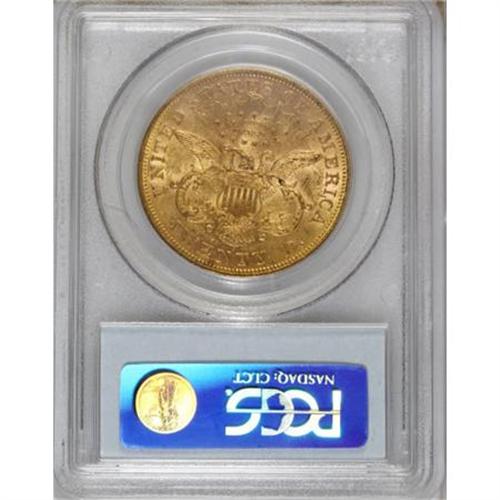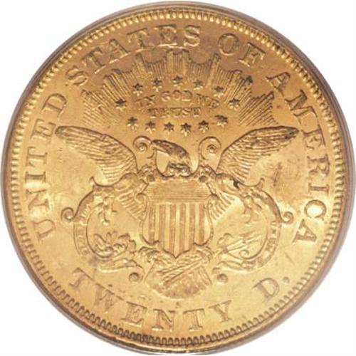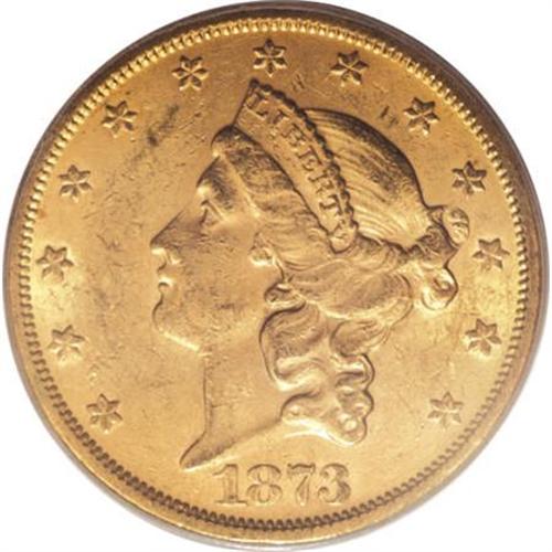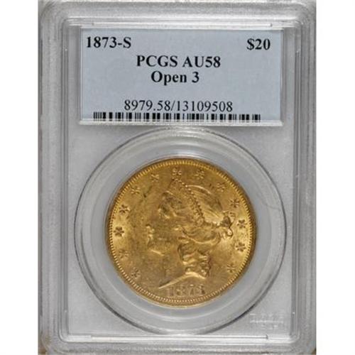 <B>1873-S $20 Open 3 AU58 PCGS.</B></I> Because of the distance between the two coasts, the new Open 3 double eagle dies from Philadelphia took their time reaching the San Francisco Mint. By the time of arrival, most 1873-S twenties needed for the year had already been coined. Some Open 3 pieces were struck, but the issue is undeniably scarce. This is a moderately abraded and partly lustrous near-Mint example.<BR><BR><b>Shipping:</b> Coins & Currency (<a target="_blank" href="http://www.heritageauctions.com/common/shipping.php">view shipping information</a>)